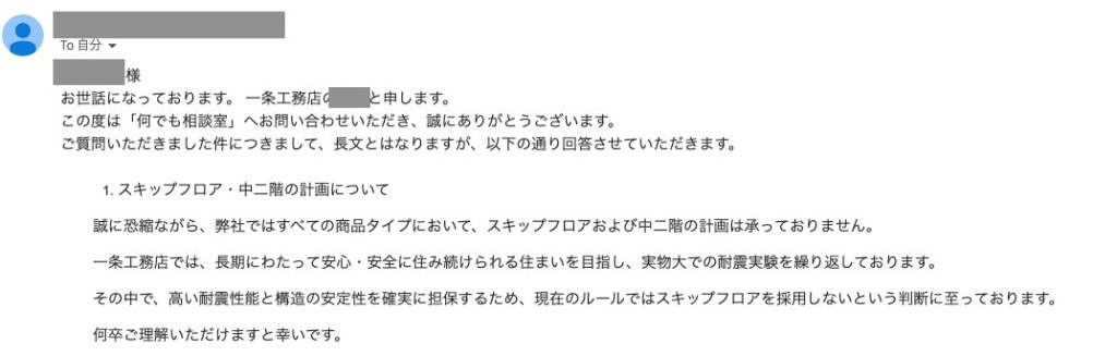 一条工務店にスキップフロアの採用可否について、以下の内容を直接問い合わせてみました。